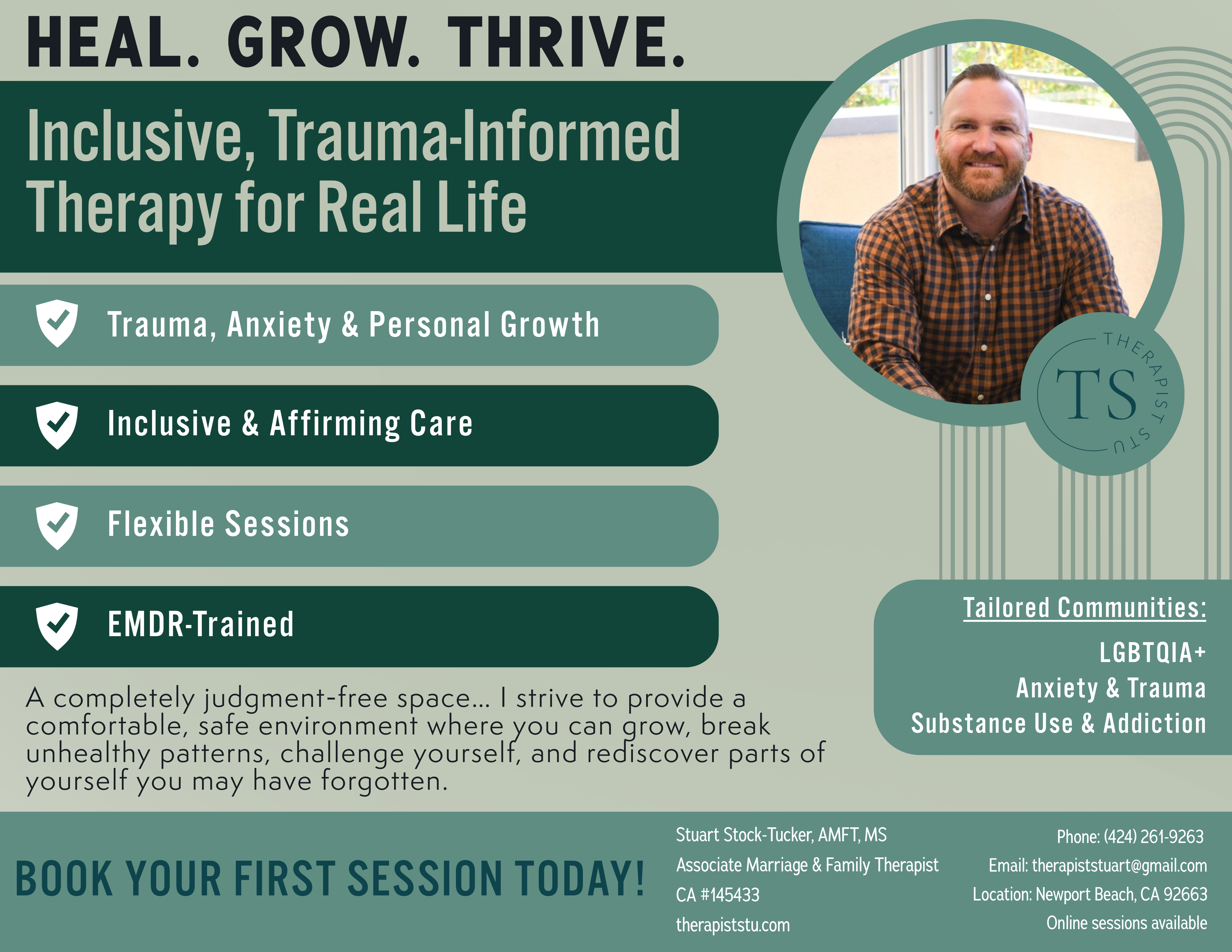 Hello, I’m Stuart Stock-Tucker, an Associate Marriage and Family Therapist based in Newport Beach, CA. My journey into therapy began with a Bachelor of Arts in Recreational Therapy in 2019, which ignited my passion for helping others navigate life's challenges. I earned my Master's in Marriage and Family Therapy from California State University, Long Beach, and I am currently under the supervision of Jennifer Smith, LMFT (License #35595) Psychology Today.