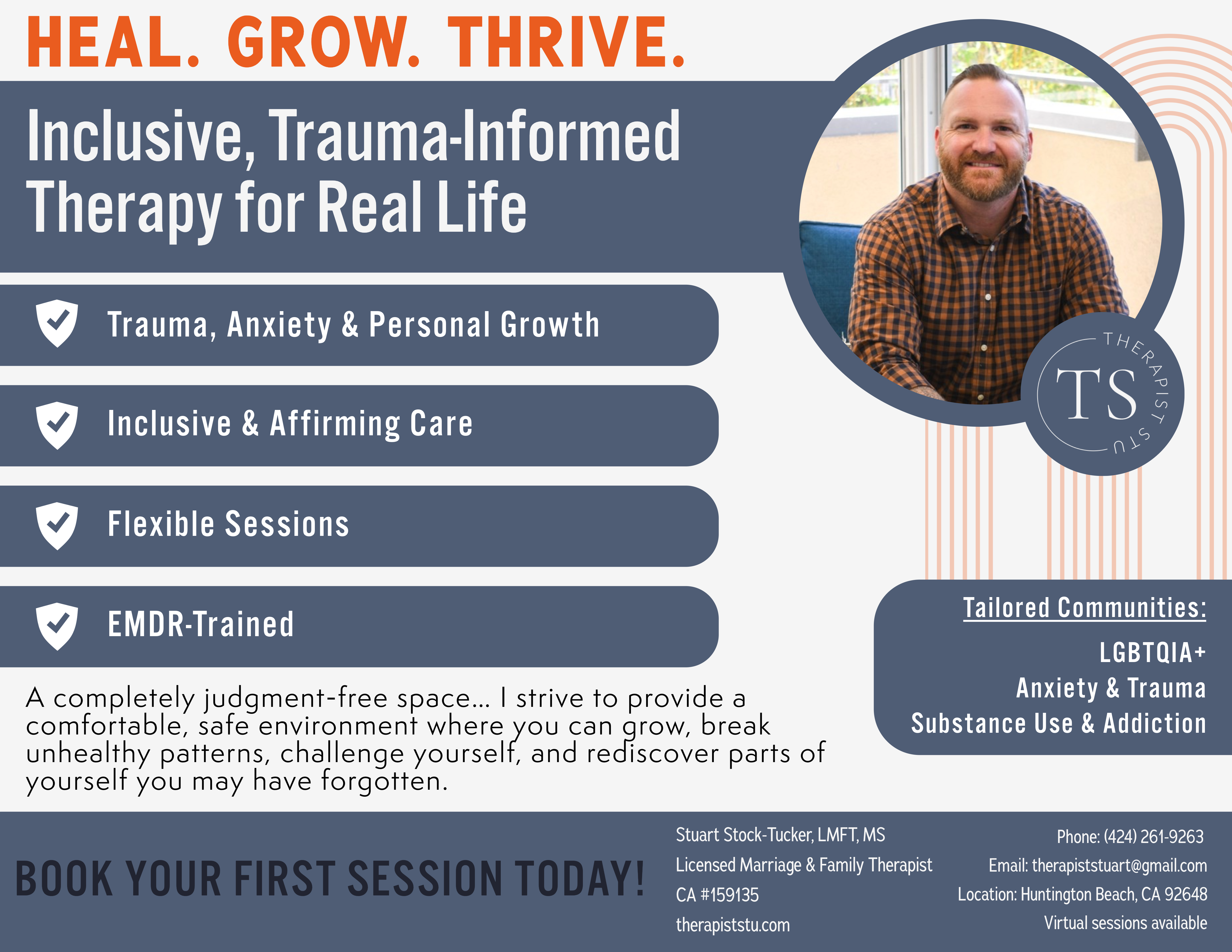 Hello, I’m Stuart Stock-Tucker, a Licensed Marriage and Family Therapist (CA #159135) based in Huntington Beach, CA. My journey into therapy began with a Bachelor of Arts in Recreational Therapy in 2019, which ignited my passion for helping others navigate life's challenges. I earned my Master's in Marriage and Family Therapy from California State University, Long Beach.